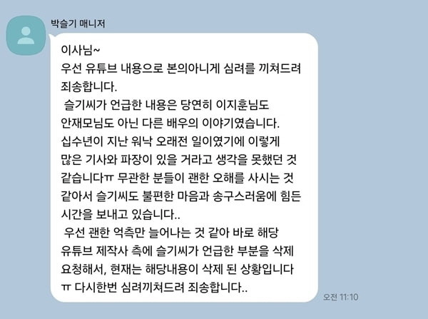 한편 해당 논란을 접한 누리꾼들은 "이 지경이면 박슬기가 똑바로 밝혀야지 지 피해 입었다고 밝혀놓고 남한테 피해주는건 괜찮나?", "사과도 매니저가 하고. 이게 대충 넘어갈 문제인가?", "실명 공개혀 애먼사람 잡지말고 설마 조회수 늘릴려고 조미료 친거 아니지?", "이래서 함부로 얘기하면 안됨 괜한 사람 욕 먹이잖아" 등과 같은 반응을 보였습니다.